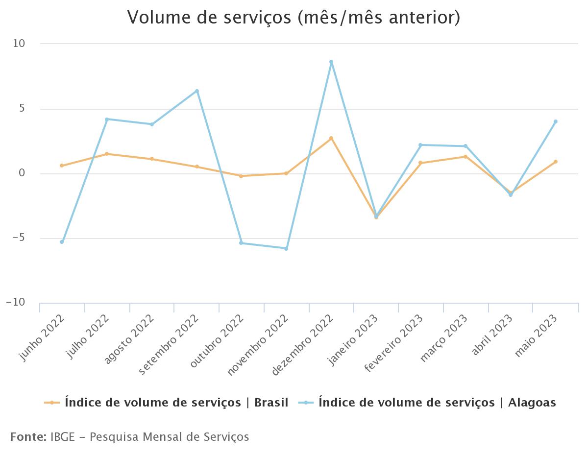 No mês de maio deste ano, o volume de serviços prestados em Alagoas foi de 4%, superando a média nacional, que ficou em 0,9%. Os dados são da Pesquisa Mensal de Serviços (PMS), divulgada pelo Instituto Brasileiro de Geografia e Estatística (IBGE).